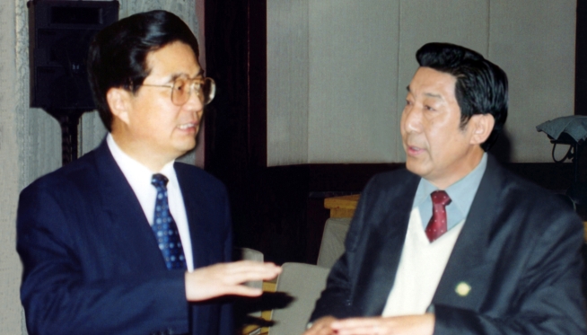 2000年10月26日 中央政治局常委、國家副主席胡錦濤與拉巴平措總干事交談