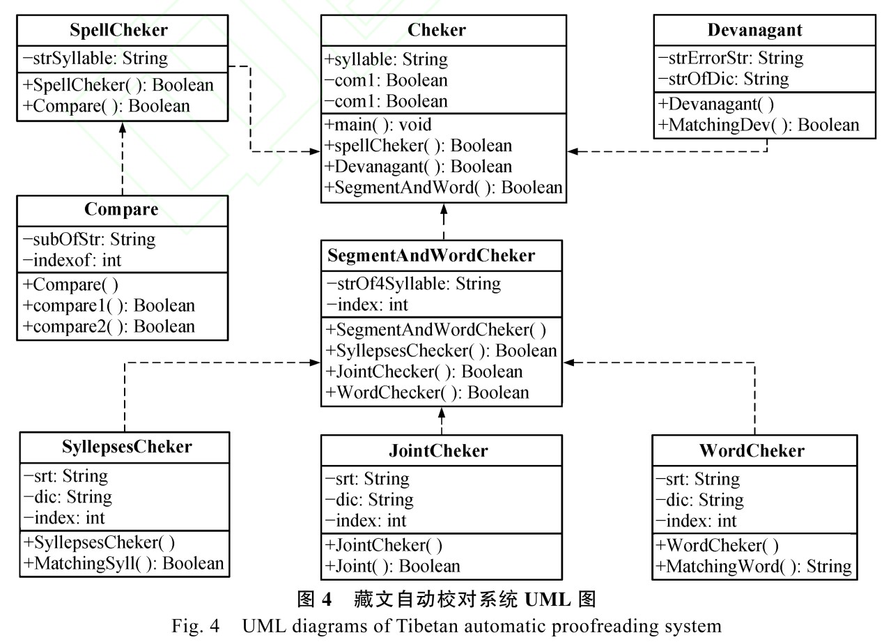 在藏文音節(jié)拼寫檢查中,主要有 SpellCheker 類和 Compare 類來(lái)完成。SpellCheker 類完成拼寫檢查的內(nèi)容,Compare 類實(shí)現(xiàn)藏文音節(jié)規(guī)則模型算法的功能。Devanagant 類完成梵音轉(zhuǎn)寫藏文的詞典匹配功能,如果匹配成功,輸出梵音轉(zhuǎn)寫藏文,否則,輸出標(biāo)記錯(cuò)誤的藏文字符串。在接續(xù)關(guān)系檢查和詞語(yǔ)檢查中,藏文字符串和位置索引標(biāo)記 index 作為輸入, SegmentAndWordCheker 類完成虛詞兼類過(guò)濾、匹配格助詞和不自由虛詞、匹配詞語(yǔ)的功能, 負(fù)責(zé)完成藏文接續(xù)關(guān)系和詞語(yǔ)正確性檢查。虛詞兼類由SyllepsesCheker 類來(lái)完成,排除存在歧義的可能性;接續(xù)關(guān)系的檢查由 JointCheker 類來(lái)完成,按照接續(xù)關(guān)系檢查算法,檢查格助詞和不自由虛詞接續(xù)關(guān)系的正確性;詞語(yǔ)檢查由 WordCheker 類來(lái)完成,采用