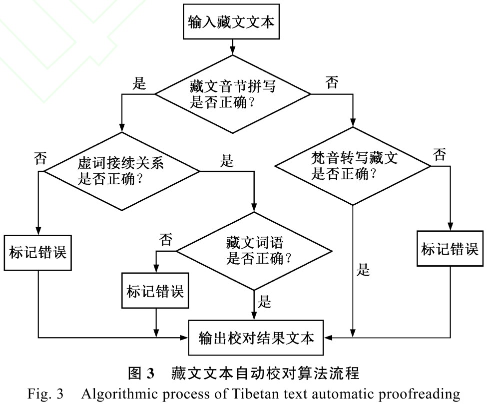 2 梵音轉(zhuǎn)寫藏文錯(cuò)誤檢查,若正確,轉(zhuǎn)到 5,否則做標(biāo)記錯(cuò)誤,并轉(zhuǎn)到 5;