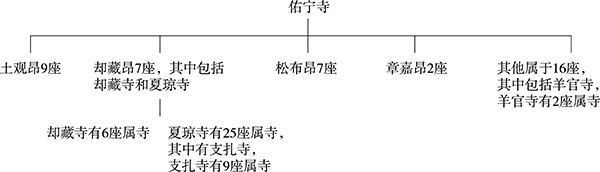 2、二級以上層級結(jié)構(gòu)模式。產(chǎn)生這種層級機(jī)構(gòu)模式的最直接原因有兩點(diǎn):一是主寺規(guī)模很大,下轄的寺院數(shù)量眾多,分布范圍較廣泛,其中有些屬寺衍生了自己的子寺;二是由于歷史發(fā)展的機(jī)遇或其他原因,屬寺的規(guī)模和影響開始擴(kuò)大,逐漸成為一片區(qū)域內(nèi)的中心寺院,產(chǎn)生了很多屬寺。湟水流域的佑寧寺系統(tǒng)是這一層級結(jié)構(gòu)模式的典型。歷史上,佑寧寺堪稱“朵麥藏區(qū)所有設(shè)有講經(jīng)院的寺院之母寺”[10],下轄很多屬寺,尤其是其屬寺夏瓊寺和卻藏寺,后來逐漸成為青海藏區(qū)的大寺,派生出來很多“孫寺”,甚至“曾孫寺”。