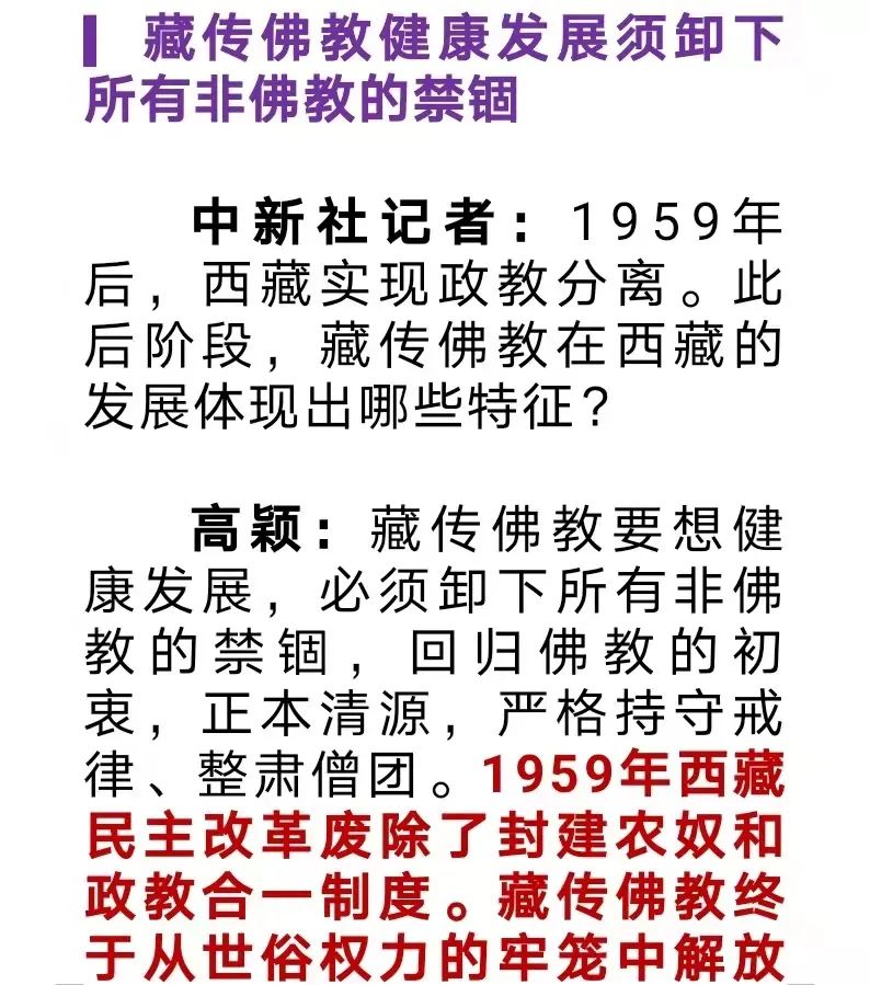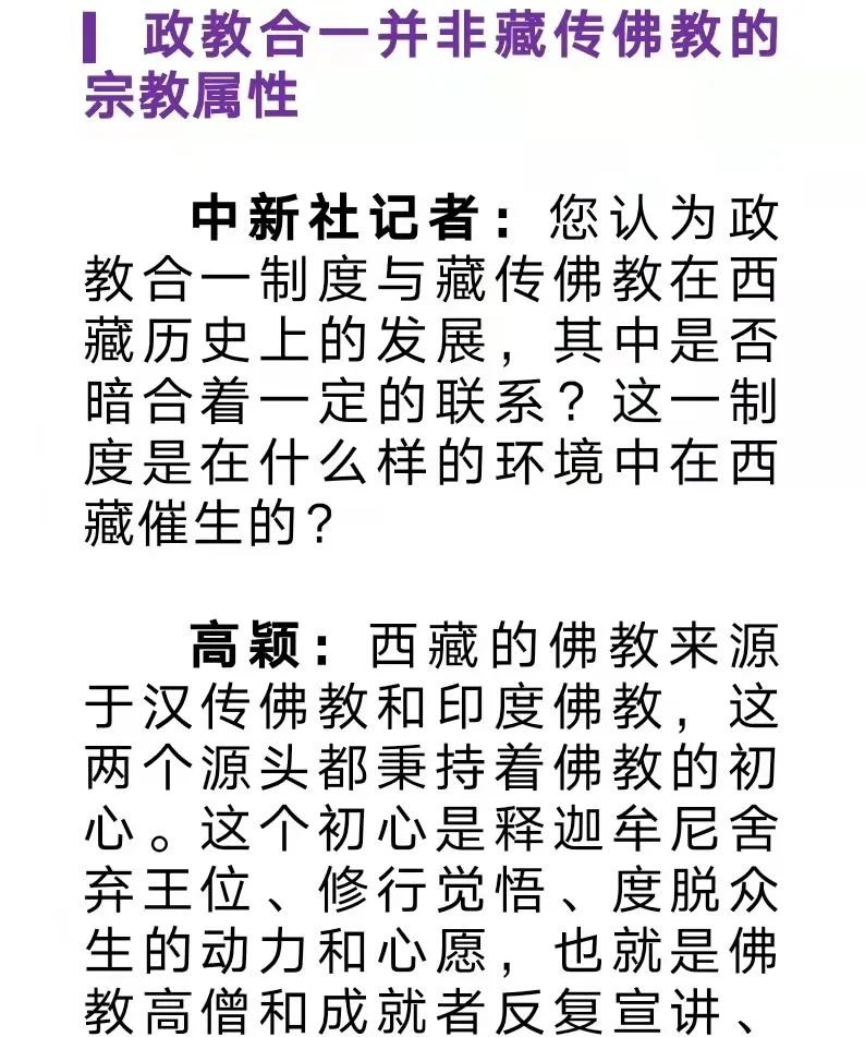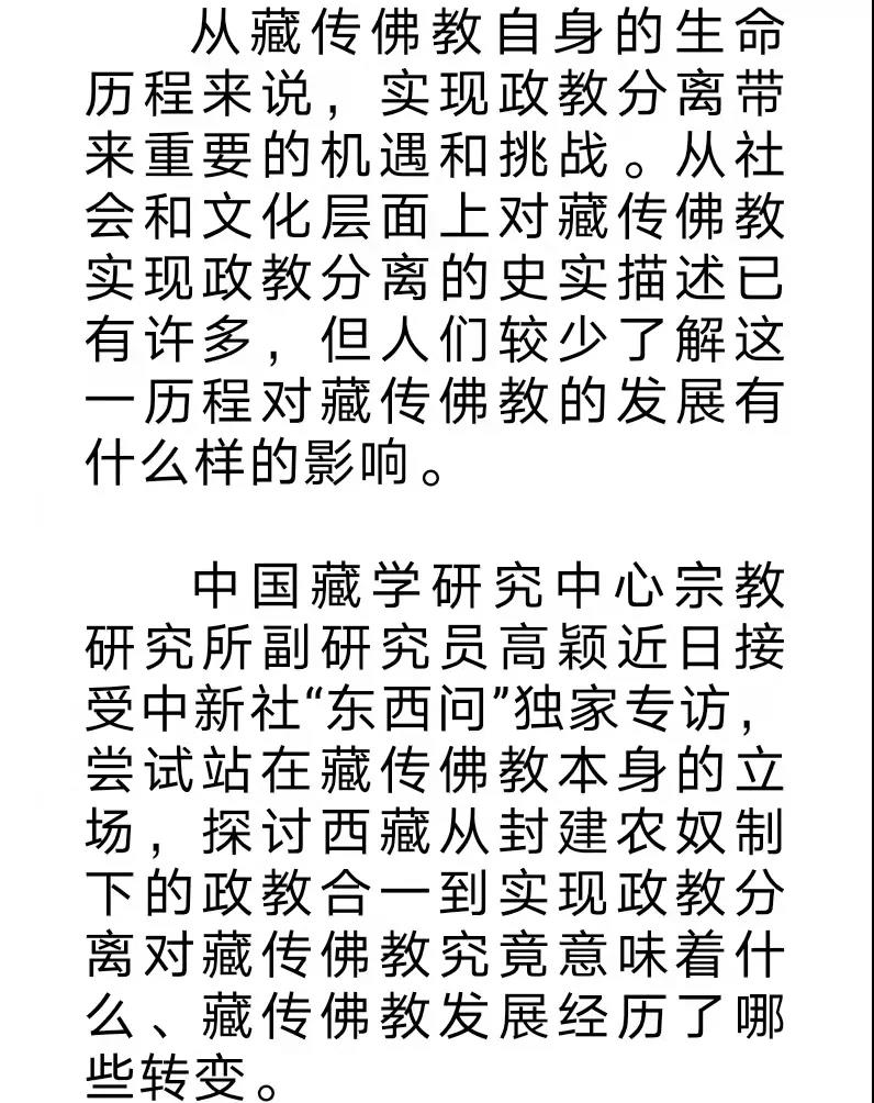 按:中國藏學(xué)研究中心宗教研究所副研究員高穎日前接受中新社“東西問”專訪,談?wù)谭蛛x對于藏傳佛教健康發(fā)展的重大意義和深遠(yuǎn)影響。