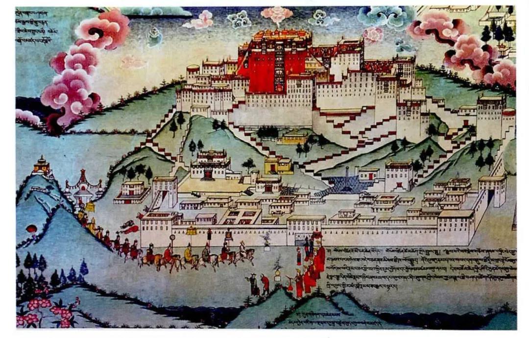【九世達(dá)賴?yán)锴巴歼_(dá)拉宮坐床(羅布林卡壁畫(huà))。楚翹攝】