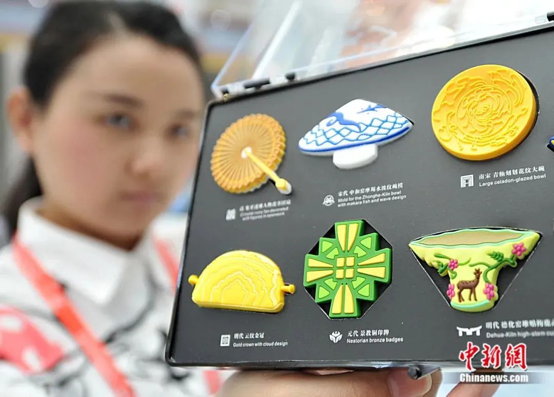 (2015年5月,福建博物院展示以元代景教銅印牌為素材的文創(chuàng)產(chǎn)品冰箱貼(下排左二)。中新社記者張斌攝)