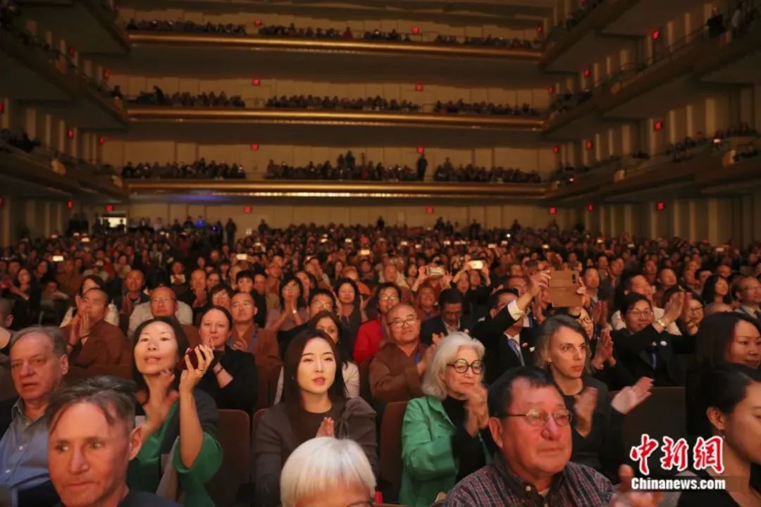 (2019年10月,中國佛教梵唄音樂會在美國紐約林肯中心登臺演出,大衛(wèi)·芬格音樂廳內(nèi)座無虛席。梵唄指佛教作法事時的歌詠贊頌之聲,是中國佛教音樂的最初起源。杭州靈隱寺、開封大相國寺、鄭州少林寺武僧團、云南總佛寺、北京雍和宮等中國佛教界著名寺院藝術(shù)團隊皆在演出之列。中新社記者廖攀攝)
