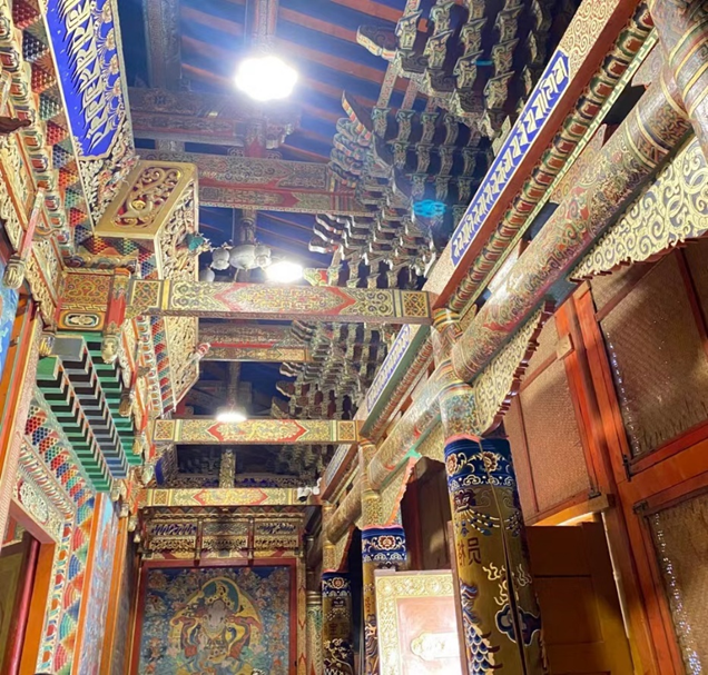 下午,調(diào)研組一行參觀了吾屯下寺。吾屯下寺,藏語(yǔ)為“????????????????????????????????”,意為“吾屯具善圓滿洲”。吾屯下寺的主尊千手千眼觀音是鎦金泥塑,高達(dá)10多米,細(xì)節(jié)極其精致,由全寺泥塑高手合力塑成的,代表著當(dāng)代吾屯下寺最高的泥塑水平,也是漢、藏、土等民族文化交融的產(chǎn)物。