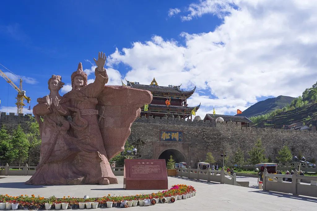 ▲松贊干布時期,佛教從印度和漢地兩個方向傳入藏地。文成公主與赤尊公主的入藏就是佛教正式入藏的標志。圖為松潘古城松贊干布和文成公主雕像。(圖片來源:視覺中國)