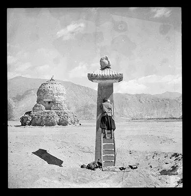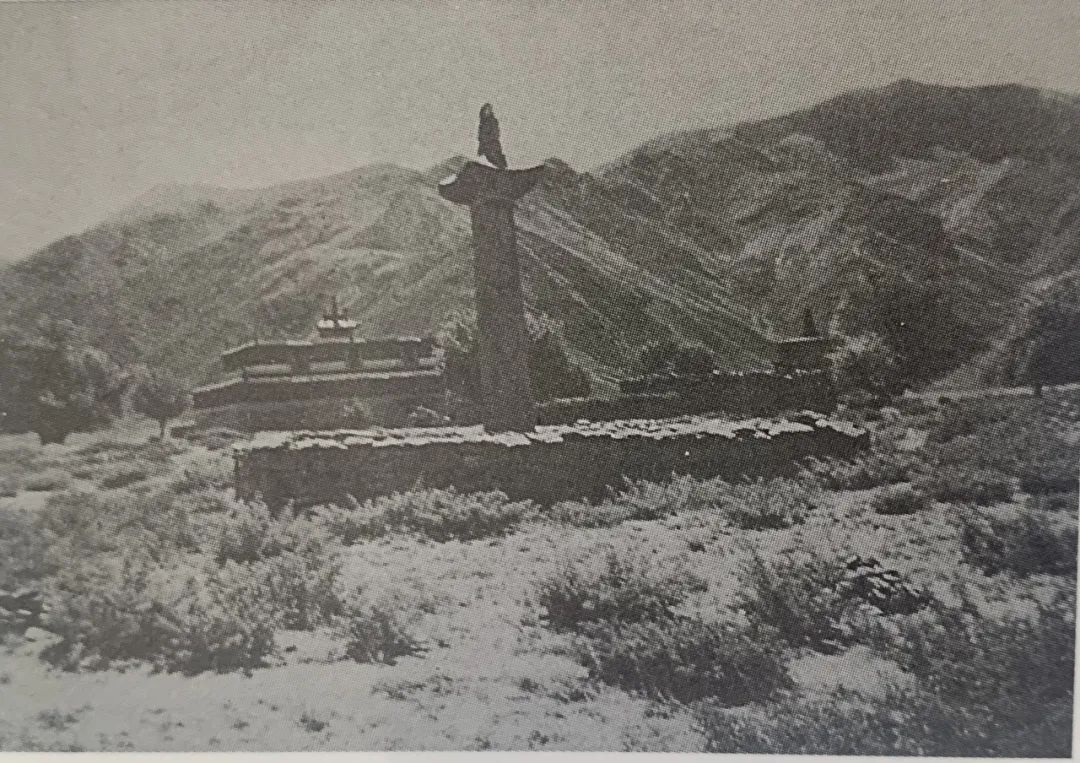 1948年黎吉生所攝當時存世的噶瓊寺碑及巨大佛塔舊影。來源:Tibet Album